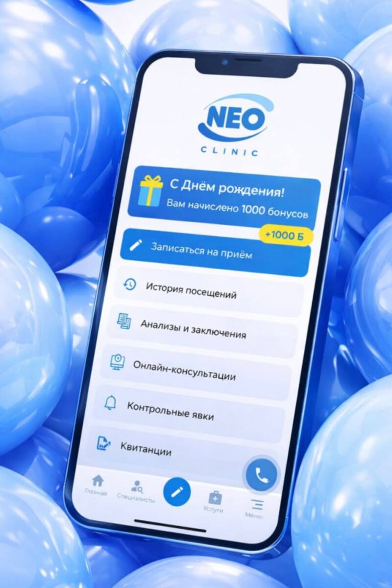 💙 🎁 В честь дня рождения каждому пациенту начисляется 1000 бонусов ✨ Бонусы приходят за 7 дней до даты рождения ⏳ Использовать их можно до 7 дней после дня рождения Бонусами можно оплачивать услуги клиники — отличный повод позаботиться о себе!💫 Мой личный кабинет в NEO-Clinic! 🎁 500 бонусов за регистрацию Если вы ещё не зарегистрированы — самое время это сделать