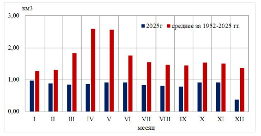 Ростовская область, 22 января 2026, DON24.RU. Объем годового стока реки Дон в створе станицы Раздорской по состоянию на 2025 год составил всего около 10 куб. км, что относится к одному из самых низких показателей за все время. Подобный уровень воды наблюдался лишь в 1972 и 2020 годах, сообщает Азово-Черноморского филиал ГНЦ РФ ФГБНУ «ВНИРО» («АзНИИРХ»). Надежда на благоприятный исход в вопросе обеспеченности реки Дон водой в этом году сохраняется у ученых благодаря накоплению снега в верховьях и средней части бассейна. Также в районе Ростова на водоеме отмечают полный ледостав. Фото: пресс-служба «АзНИИРХ». Внутригодовое распределение стока реки Дон, станица Раздорская (1952–2025 гг. и 2025 г.) «Объем стока во многом определяется гидрометеорологическими условиями, которые с ноября по март 2024–2025 годов не способствовали ни накоплению снега, ни формированию высокого весеннего половодья. По результатам весеннего половодья с 07.03.2025 по 17.05.2025 фактический приток воды в Цимлянское