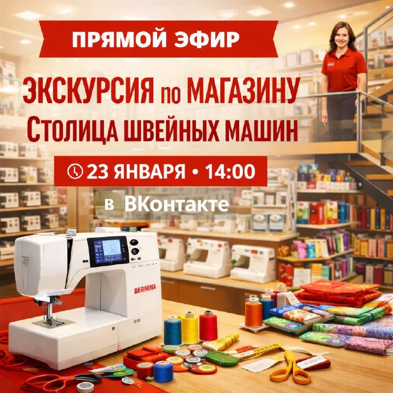 Завтра, 23 января в 14:00, выходим в прямой эфир в нашей группе ВКонтакте — устроим большую экскурсию по магазину «Столица Швейных Машин