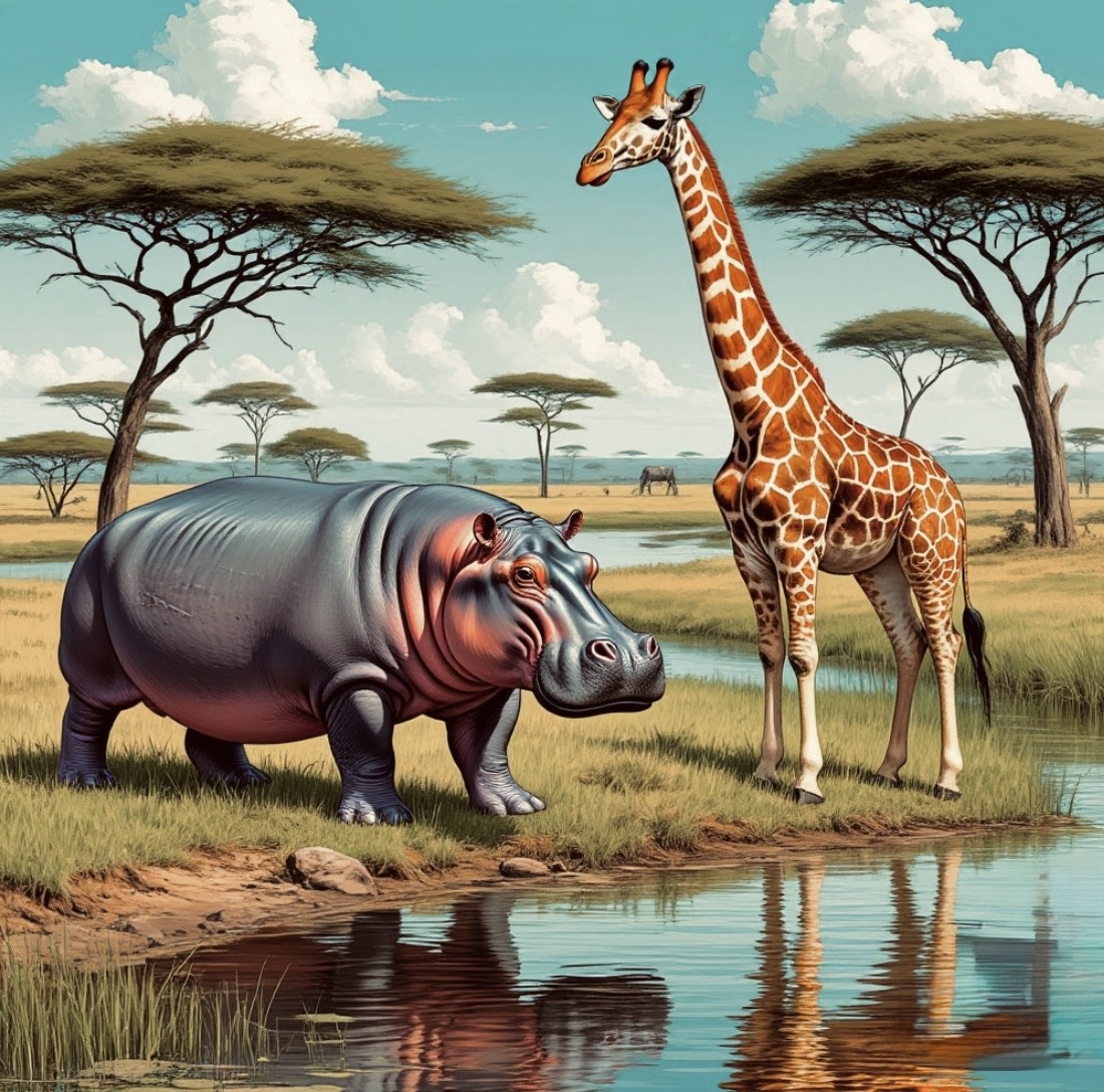 В самом сердце Саванны, где сходились тропы всех зверей, стояло Великое Озеро Спокойствия. У его берегов жили два непохожих друга: Жираф Долговзор и Бегемот Близ.