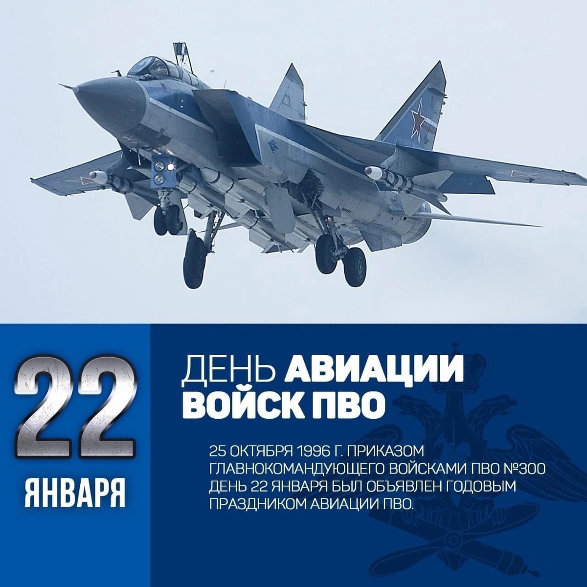 Сегодня — профессиональный праздник воинов, обеспечивающих безопасность воздушного пространства страны в круглосуточном режиме. История праздника берёт своё начало в 1942 году, когда вышел в свет Приказ Наркомата Обороны СССР о подчинении авиационных истребительных частей и соединений, осуществляющих задачи ПВО, командующему войсками ПВО территории страны. За годы войны истребительная авиация совершила до 170 тысяч самолето-вылетов и уничтожила в воздушных боях и на аэродромах 4170 самолетов врага. Дата 22 января приказом Главнокомандующего Войсками от 25.10.1996 г. объявлена годовым праздником авиации ПВО. Администрация канала ВоинДВ поздравляет с праздником всех причастных! Благодарим за вашу невероятно важную работу, желаем удачи и всего наилучшего! @voin_dv | @voin_dv в MAX