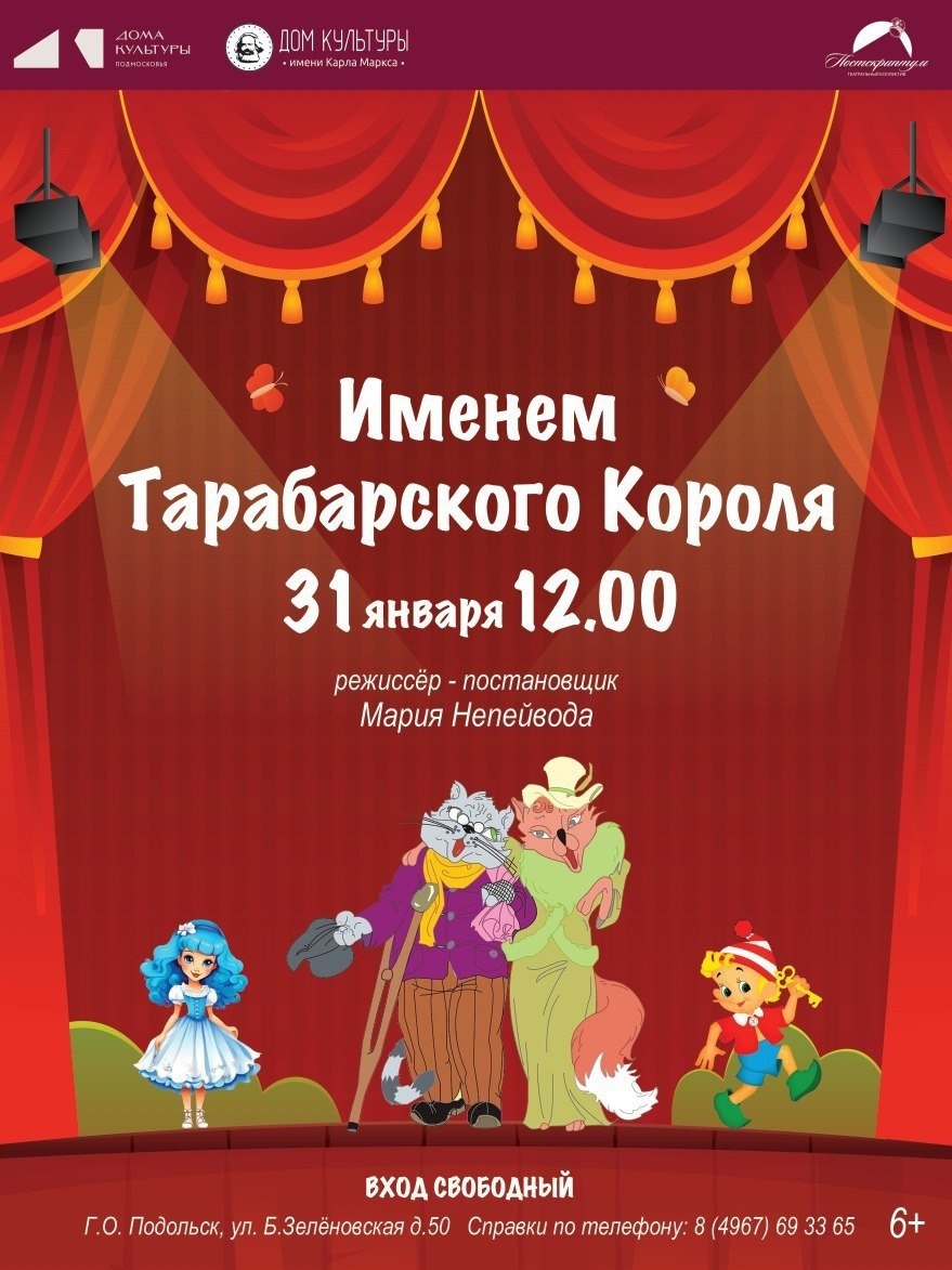 " Дорогие зрители! Театральный коллектив «Постскриптум» приглашает вас на спектакль «Именем Тарабарского короля». 👑 💫На этот раз театр кукол принадлежит самим куклам. Но Карабас не намерен сдаваться! Он по-прежнему мечтает вернуть свой театр! И в этом ему помогает Дуремар, задумавший похитить Мальвину с помощью старых знакомых – кота Базилио и лисы Алисы. 🎬Режиссёр спектакля Мария Непейвода 🚫 Возраст: 6+ 📆 31.01.2026 🕒 12:00 🏢 ДК им. Карла Маркса 📍 г. Подольск, ул. Большая Зелёновская, 50 💰 Вход свободный❗️ ⭐Поддержать канал голосом 🍰Где поесть в Подольске #спектакльПодольск ✅ Мероприятия Подольск https://dzen.ru/id/66ed500f7b5671493eca3fd6 http://vk.com/podolsk_events http://dzen.ru/podolsk_events