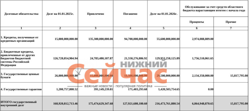 Государственный долг Нижнего Новгорода к началу 2026 года составил 216,5 млрд рублей. Информация размещена на сайте министерства финансов региона. В 2025 году (по состоянию на начало января) госдолг региона составлял 168,9 млрд рублей. Более половины суммы долга (около 130 млрд рублей) составляют федеральные бюджетные кредиты. Еще 55,6 млрд рублей – это кредиты коммерческих банков. В 2025 году область активно брала новые займы. Было привлечено свыше 135 млрд рублей коммерческих кредитов и почти 25 млрд рублей бюджетных кредитов. На обслуживание всего долга в прошлом году потратили 6,86 млрд рублей. Напомним, Нижегородская область оказалась лидером в России по размеру государственного долга. Фото: Минфин