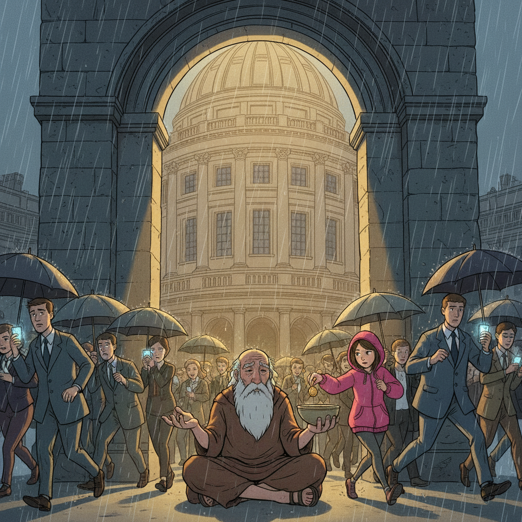 — Хлам — это то, что ты создал, а не ты сам, — отрезал Диоген. — Ты можешь сидеть здесь, на холодном камне, и дышать. Чувствовать ветер. Видеть, как эта девочка смеется, а тот юноша грустит. Ты жив. Зачем тебе быть «нужным» системе? Будь нужен самому себе. Достаточно?
