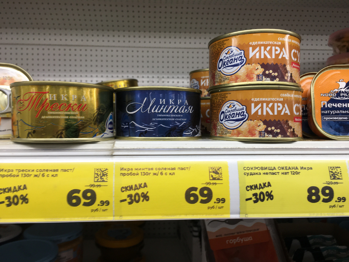 Ну так вот, Друзья, наткнулась глазом на икорку рыбную. И не какую-нибудь там красную, а гораздо лучше: тресочки и минтаюшки. Правда, рядом стоящая икра судака портила общую картину, но это лишь на первый взгляд, ибо по цене мало чем отличалась от минтаюшкиной.