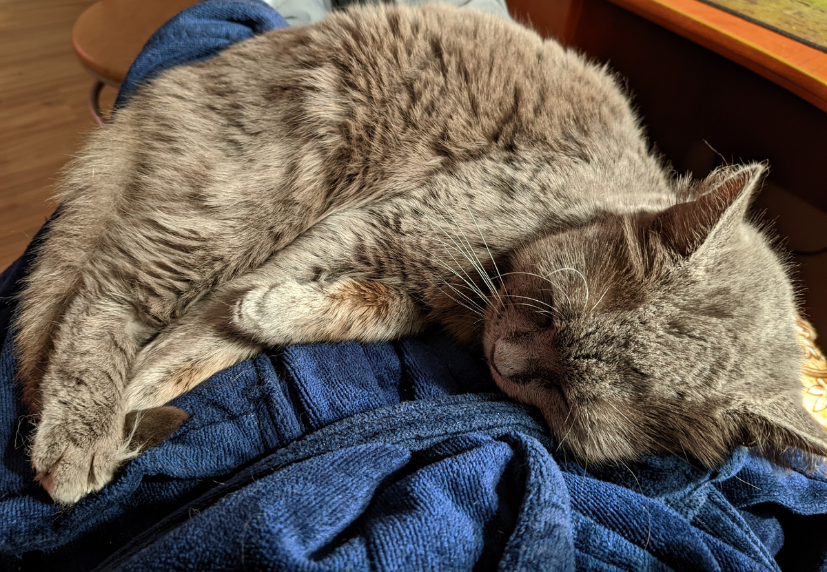У нас всё по-прежнему, всё традиционно. Вчера вечером работали, трудились на благо семейного бюджета. Ночью Дымка придумала как меня разбудить и заставить встать с постели. У нас на всякий случай в спальне стоит лоток Дымки, ну мало ли что может случиться. Но мы не очень хотим, чтобы это случилось, поэтому бдим, если Дымке надо, а не хочется во двор из-за морозной погоды, то она норовит именно туда направить свои лапы. Мы успеваем провести с ней нравоучения, ну т.е. я её беру на руки и несу к выходу, рассказывая, что не всё так плохо, вон, на Камчатке вообще снегом дома заносит. А вчера вечером мы решили ночью Дымку больше не кормить, раз уж лечение домашнее проходит. Но это мы решили, а она была супротив такого решения категорически мяучила против. И вот, сплю, вдруг слышу, в лотке её лапы зашуршали, гребет значит. Я вскакиваю, бегу к лотку, а Дымки там нет, она уже сидит у дверей спальни и делает вид, что это не она, но её надо срочно покормить. Так продолжалось целых два раза. Кошки