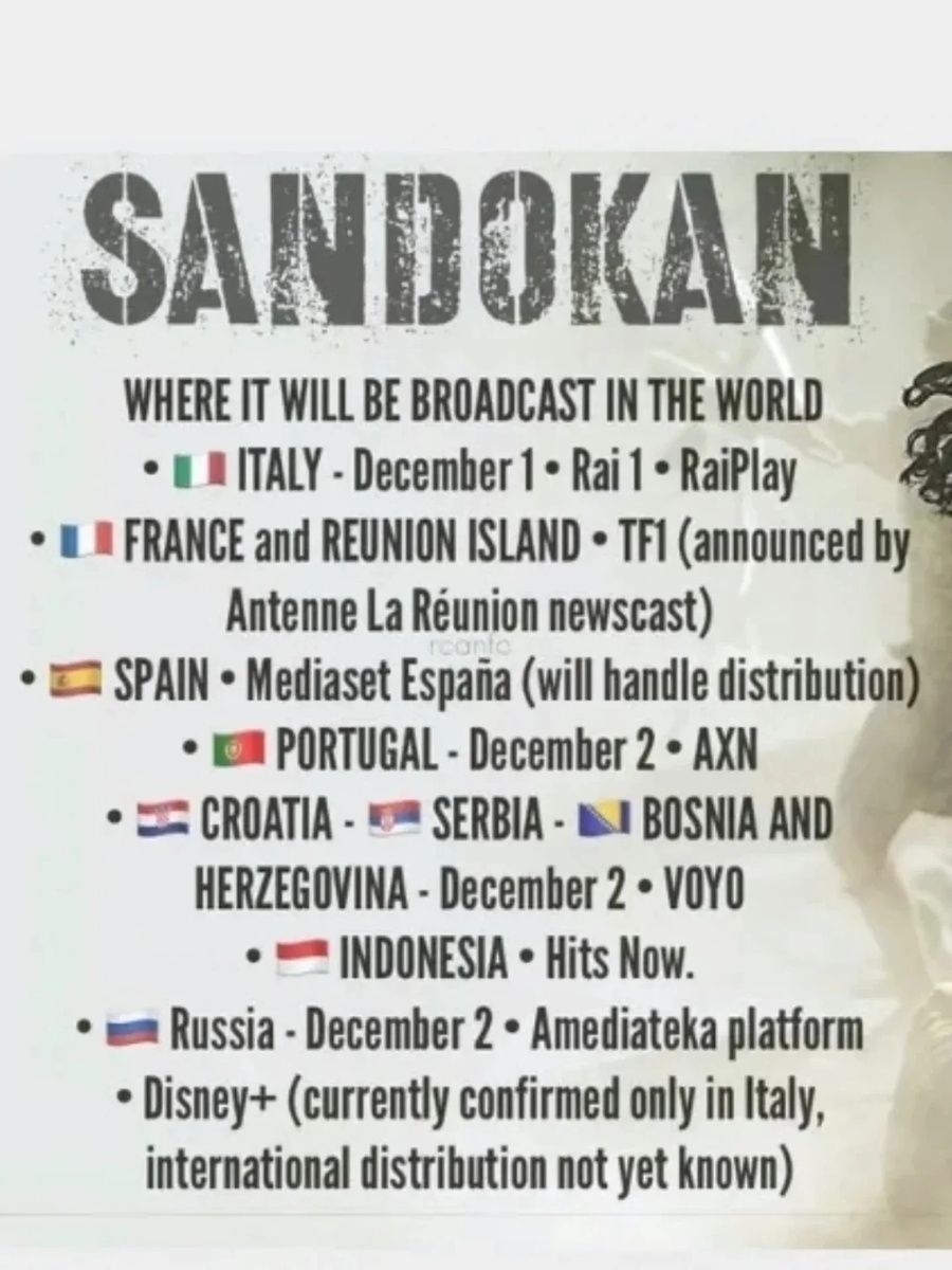 Сериал вышел на RAI 1 1 декабря, а 2 декабря были показаны первые две серии на платформе Амедиатека в России. Сериал официально продан во многие страны, в том числе и нам , так что мы посмотрели этот фильм вместе со всем остальным миром. Вы только посмотрите географию распространения сериала Сандокан по миру. Впечатляет, не правда ли?