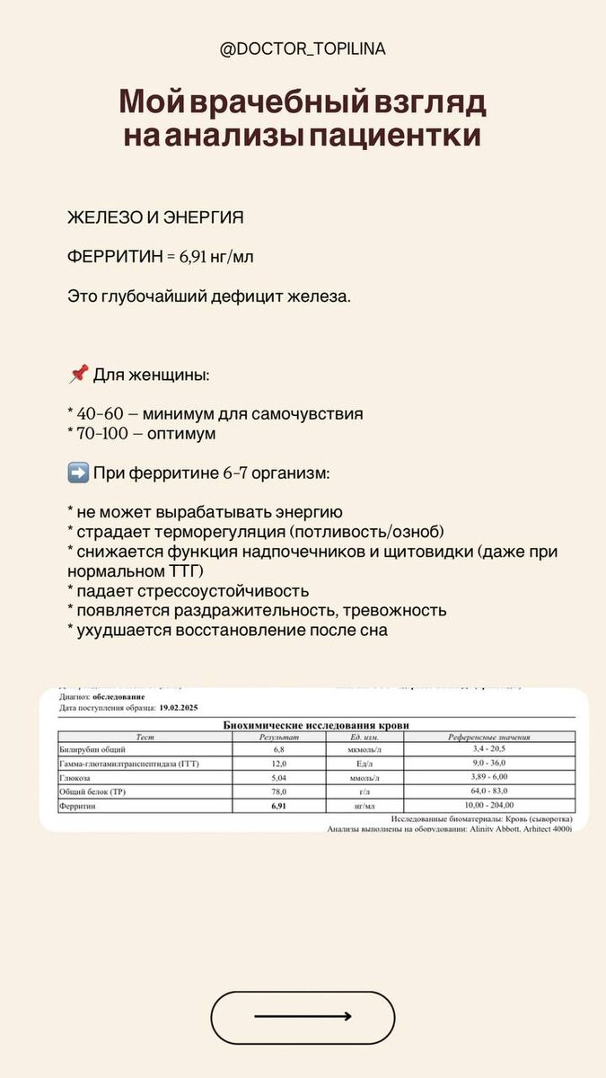 ! Ко мне пришла пациентка (38 лет): ✔️постоянная усталость, которая не проходит даже после сна ✔️ощущение, что энергии не хватает на жизнь и детей ✔️раздражительность, тревожность ✔️повышенная потливость, плохая переносимость жары и плотной одежды ✔️колебания веса, снижение аппетита ✔️внутреннее напряжение «даже когда внешне всё спокойно» ✔️узлы щитовидной железы, кисты, изменения молочных желёз При этом ей годами говорили: «Это стресс» «Это возраст» «Гормоны в норме» ✔️А состояние только ухудшалось. Психологически: ✔️постоянное внутреннее напряжение, ощущение «я всё время собрана» ✔️тревожность без явных причин ✔️чувство вины перед детьми из-за отсутствия сил и ресурса ✔️страх, что «так теперь будет всегда» ✔️ощущение, что она теряет себя, живёт «для всех, кроме себя» ✔️сложность говорить «нет», даже когда плохо ✔️сильная самокритика и сравнение себя с другими ✔️усталость от роли «сильной» ЧТО ПОДТВЕРДИЛИ АНАЛИЗЫ По анализам стало понятно главное: ❗️Проблема не в одном гормоне и
