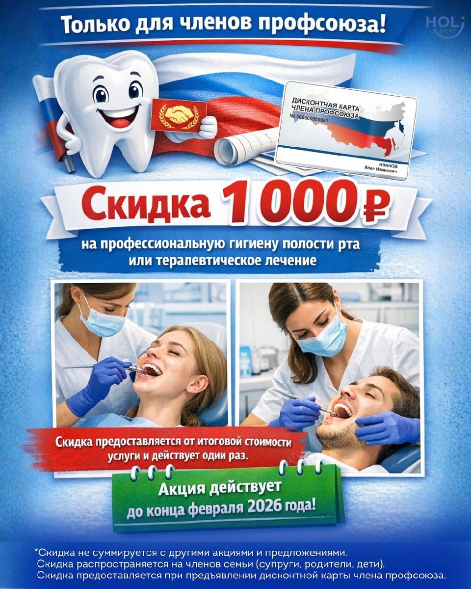 ! Акции от нашего партнера стоматологии "HoliDent" для членов профсоюза: 1000 рублей на профессиональную гигиену полости рта и терапевтическое лечение. Акция до конца февраля 2026 года. По условиям акции более подробно расписали на макете. ✅ Записаться в клинику можно: 📞 по телефону : +7 (912) 076-77-35 📩 через сообщения сообщества стоматология "HoliDent" г.Воронеж ❗ Адрес: г. Воронеж, ул. Хользунова, 72б Сайт https://holident.ru/