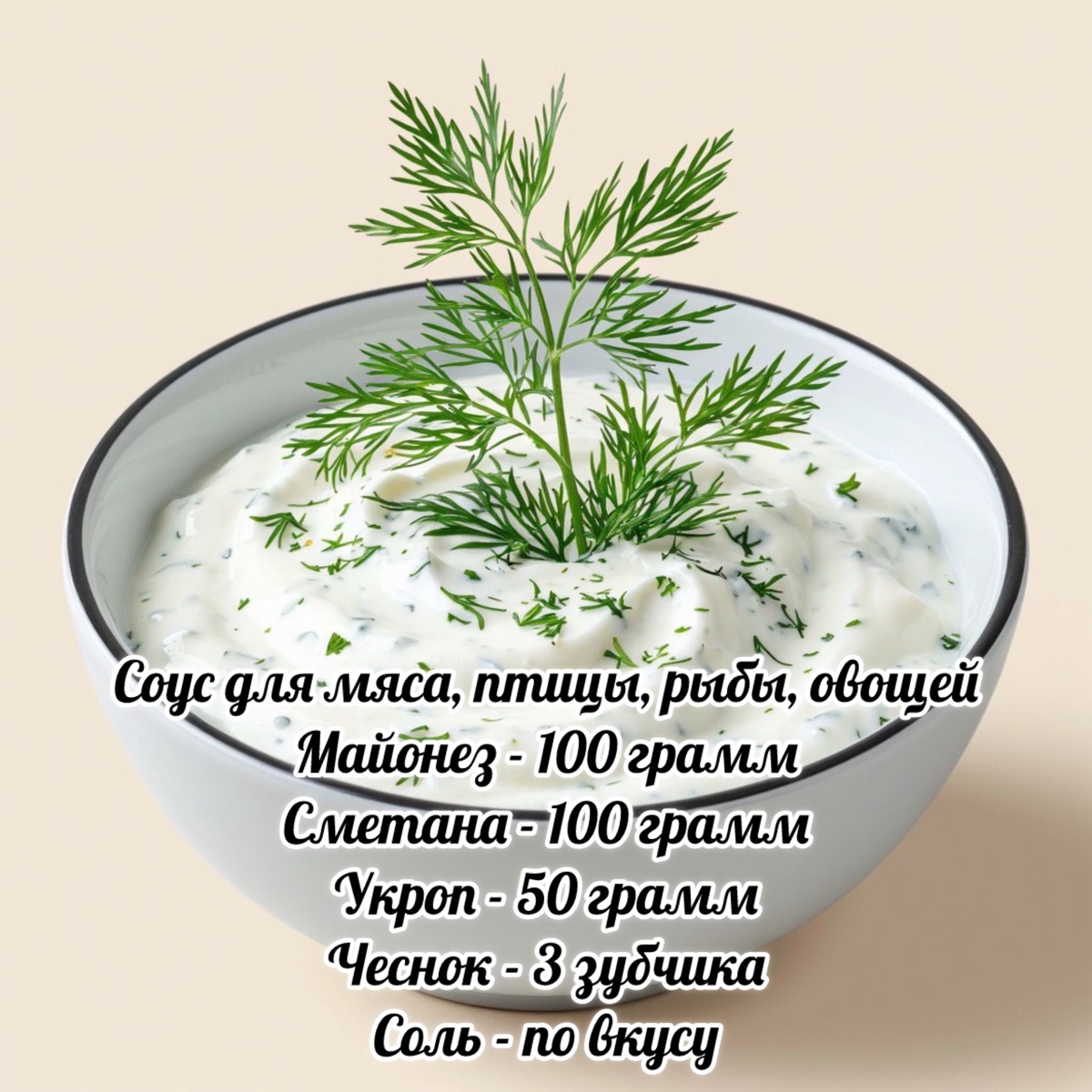 Нежный и приятный соус прекрасно сочетается с мясом, птицей, рыбой, овощами. Придавая им дополнительную глубину и яркость. Готовится быстро и легко, а результат Вас удивит. Мелко измельчите укроп с чесноком, добавьте немного соли, перемешивайте, слегка надавливая на ингредиенты. Оставьте постоять минут 5 (чтобы зелень и чеснок дали сок), добавьте майонез и сметану и еще раз хорошо перемешайте. Добавьте еще соли, если это требуется. Подавайте соус отдельно в соуснике, приятного аппетита!