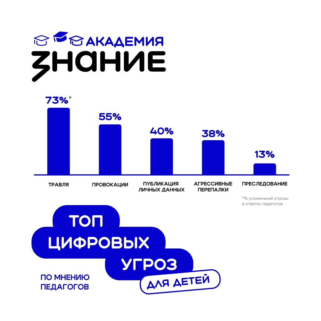 ❗️В опросе Российского общества «Знание» приняли участие 2 997 педагогов-участников курса «Цифровая гигиена: как обучать детей безопасности в интернете» от платформы Знание.Академия, 73% из которых отметили, что их ученики сталкиваются с травлей в сети. ➡️Педагоги отметили еще угрозы: 🔹Более половины педагогов (53%) отмечают проблему сознательных провокаций, втягивания детей в интернет-конфликты. 🔹40% педагогов к наиболее распространенным интернет-угрозам для учеников также относили публикацию личных данных без получения согласия. 🔹38% – агрессивные перепалки в переписке. 🔹Реже всего среди интернет-угроз для детей педагоги упоминают навязчивое преследование в сети, этот риск отметили 13% участников опроса. 🔹Педагоги старшего возраста чаще отмечают опасность цифровой среды для детей ➡️Как предотвратить травлю – научиться распознавать риск в сети, говорят педагоги. Также, они поделились, что делают при выявлении данной проблемы: 🔸61% опрошенных педагогов выбрали навык действовать