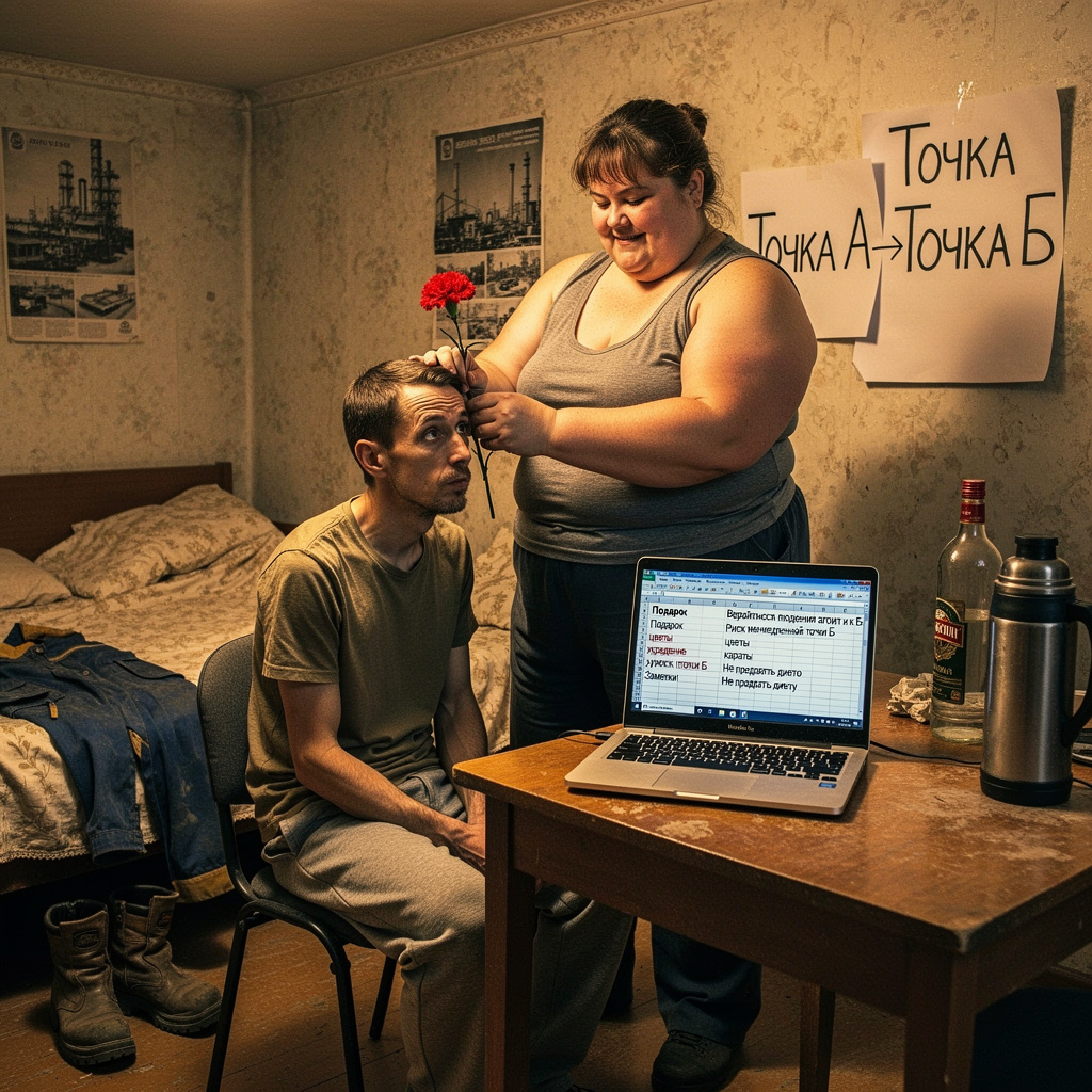 Тоня, приняв это за комплимент себе (а кто еще Наташа? Явно не она), фыркнула и увлекла за собой в кровать, как экскаватор — легковую машину. Кровать застонала на всю многоэтажку. На столе мой ноутбук лихорадочно мигнул и выключился. Эксель-таблица с ее безупречной логикой не предусмотрела главного фактора: человеческого, вернее, тониного фактора. Ни один алгоритм не смог бы просчитать, что 152-килограммовая фрезеровщица, получив в подарок кладбищенскую гвоздику и лекцию о неизбежности конца, воспримет это как высшую форму романтического помешательства.