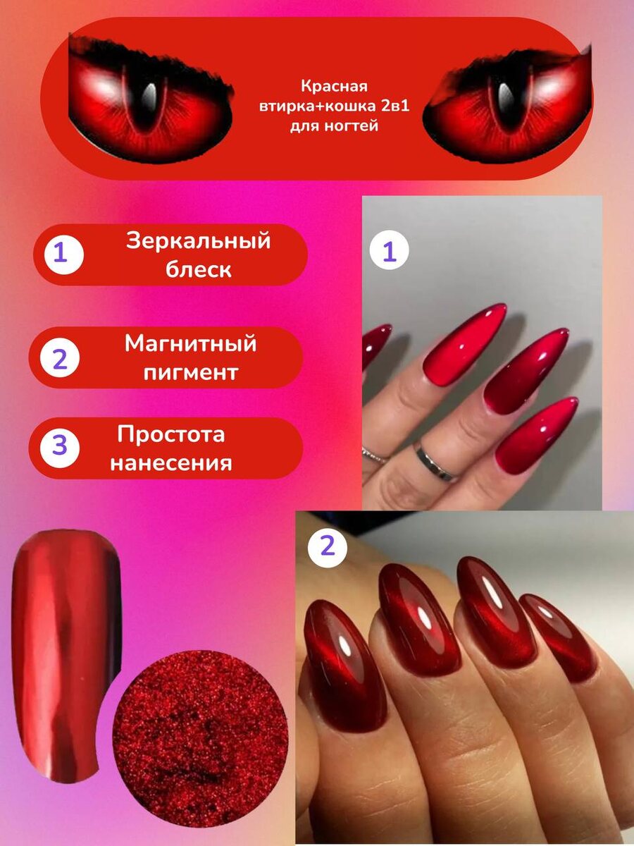 Магнитный пигмент создаёт мерцающий рельеф, который меняется в зависимости от угла освещения. Красный цвет идеально сочетается с любыми базами и акцентами. Продукт безопасен благодаря отсутствию тестирования на животных. Компактная упаковка удобна для хранения и транспортировки. Создайте уникальный дизайн ногтей с этим профессиональным средством.#втиркадляногтей #кошачийглаз #зеркальнаявтирка
