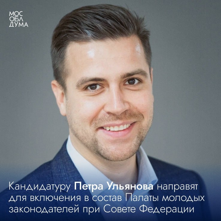 Совете Федерации Федерального Собрания Российской Федерации – представителя от Московской областной Думы» Постановлением предлагается направить для включения в состав Палаты молодых законодателей от Московской областной Думы Ульянова Петра Михайловича. Он является депутатом Совета депутатов городского округа Люберцы. 🔹Ранее его кандидатура была рассмотрена и одобрена на заседании Московского областного молодёжного парламента. «Безусловно, работа в составе Палаты молодых законодателей при Совете Федерации ФС РФ ответственна и потребует не только эффективных решений. Она подразумевает и личностный, и профессиональный рост, который должен идти в ногу с динамичным развитием этого крайне важного коллегиального органа. Опыт, полученный мной за многие годы работы в структуре общественных палат, а теперь – в статусе муниципального депутата, даёт мне и правильные ориентиры, и конкретный вектор для применения навыков. Главное – он дает понимание, решения каких задач ждут от нас люди. Благода