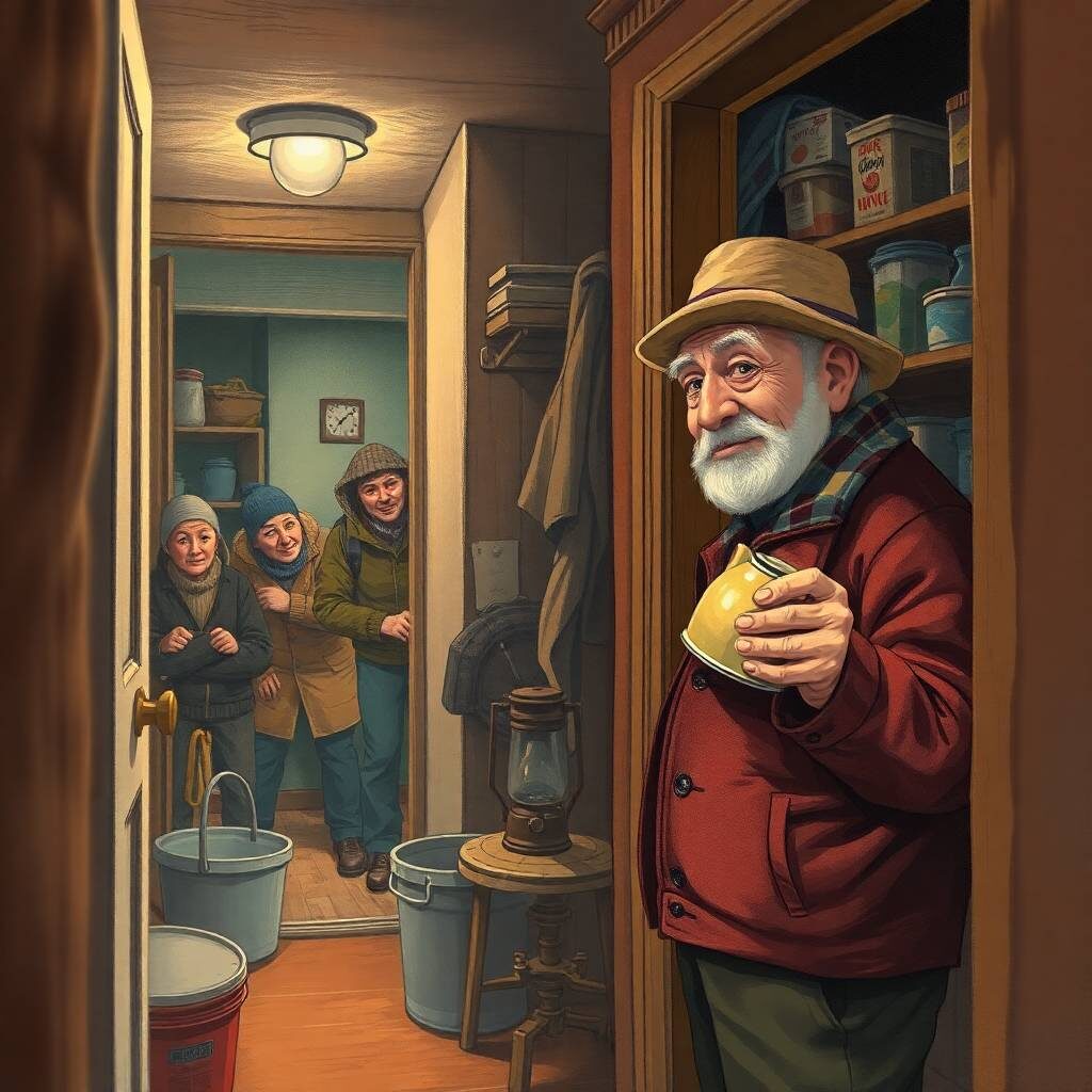 Во всём доме знали соседа Геннадия Петрович. Он был ходячим НЗ на случай апокалипсиса. В прихожей у него висела каска и лежал топорик «на случай завала». Балкон напоминал склад МЧС: канистры с водой, батарейки, гречки мешок и почему-то два весла. Соседи над ним посмеивались: «Гена, тебе бы в бункере жить, а не в хрущёвке!». Однажды зимой, в лютый мороз, домовой комитет объявил: «Завтра с 8 утра отключаем воду на сутки — аварийные работы». Весь вечер дом бурлил: «Как сутки без воды?! Кофе не сварить! Душ не принять! Катастрофа!». Суетились все, кроме Геннадия Петровича. Он спокойно достал с балкона две заранее заполненные канистры, проверил керосиновую горелку (для кипячения), занес в ванную ведро с опилками (на случай, если туалет замёрзнет), и лёг спать. Настало утро. В восемь ноль-ноль вода благополучно исчезла из кранов. В девять раздался оглушительный грохот — лопнула труба в подвале из-за мороза, и единственный стояк, снабжавший весь подъезд, превратился в хрустальный дворец из со