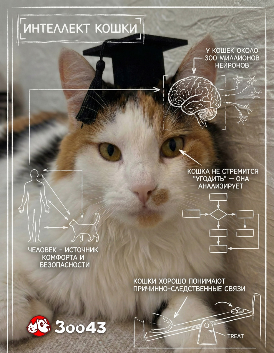Долгое время кошек считали «менее умными», чем собак — просто потому, что они хуже поддаются дрессировке. Но современные исследования показывают: интеллект кошек не слабее, он другого типа и проявляется в самостоятельности, гибкости и наблюдательности. 🧠 Учёные из Университет Киото (исследование Сатору Такаги, 2017) выяснили, что кошки обладают эпизодической памятью. В экспериментах животные помнили, из какой миски ели несколько минут назад, и соотносили это воспоминание с результатом. Такой тип памяти считается важным маркером развитого сознания и ранее приписывался в основном людям и некоторым млекопитающим. 🧠 Исследование Университет Орегона (2019) разрушило ещё один миф: кошки формируют эмоциональную привязанность к человеку. Более 65% животных продемонстрировали «безопасную привязанность». Это значит, что кошка воспринимает хозяина как источник комфорта и безопасности, а не просто «обслуживающий персонал». 💥 Дополнительные данные подтверждают интеллектуальные способности кошек: