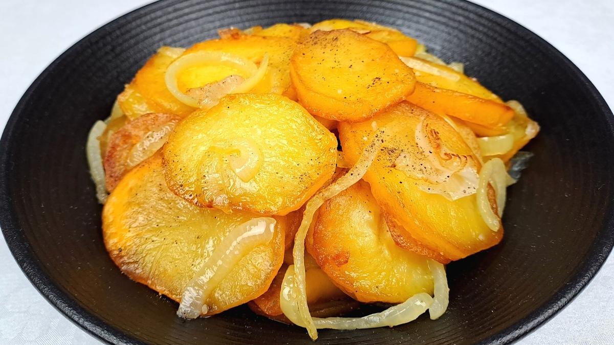 - Когда картошка будет почти готова, сдвинуть её к одному краю сковороды, а на освободившееся место выложить лук.