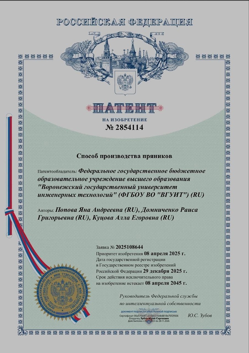 Преподаватели кафедры товароведения и экспертизы товаров экономического института Луганского государственного университета имени Владимира Даля получили патент на инновационное изобретение «Способ производства пряников». 📎 Новый способ был разработан группой исследователей: заведующим кафедрой, кандидатом технических наук, доцентом Яной Поповой и доцентом, кандидатом технических наук Раисой Домниченко. Значительную роль в этой работе сыграло многолетнее взаимодействие с преподавателем Воронежского государственного университета инженерных технологий, кандидатом технических наук Аллой Куцовой. Цель разработки заключалась в повышении пищевой ценности готовых изделий путём введения витаминов, минералов и пищевых волокон, а также в расширении ассортимента продуктов специального назначения для геродиетического питания пожилых людей. ✏️ Особенностью нового рецепта стало использование льняной муки и экстракта шиповника, обладающих повышенной питательной ценностью и отличающихся прекрасными