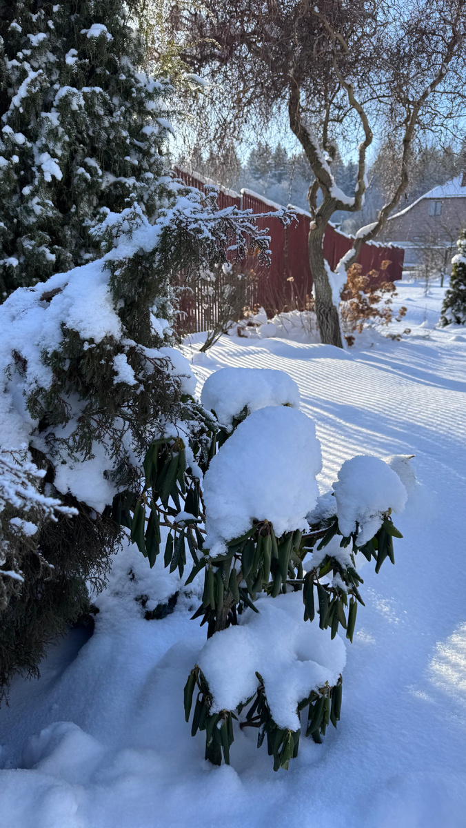 Помимо этого большого куста, в моём саду живёт миниатюрный рододендрон. Сейчас, в середине января, он полностью укрыт снегом — не видно ни веточек, ни листочков. А цветёт он фиолетовым облаком: цветочки мелкие, но невероятно красивые. Увидела это зрелище в ботаническом саду Минска — и захотела такой же необычный вечнозелёный кустик. Будь сейчас меньше снега, он стоял бы нарядный, с крошечными закрученными зелёными листиками. Но в этом году у нас особая погода. Что поделаешь? Ничего страшного.