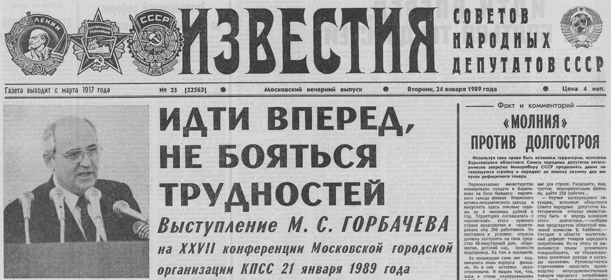 «Газеты – консервы времени» (Карл Краус) 1992, январь – Огонёк 24.01.1992 – Известия На руинах Советского Союза. Новости обычного январского дня 1992 года на первой странице Известий. 24.01.1920 – Вечерние известия 1934, январь – Безбожник 24.01.1926 – Рабочая Москва 1926, январь – Огонёк 1925, январь – Огонёк 24.01.1957 – Вечерняя Москва Лучший Павел Корчагин в великолепном исполнении Василия Ланового. 1930, январь – Безбожник 24.01.2017 – Вечерняя Москва Советская сборная триумфально дебютирует лишь на седьмой зимней Олимпиаде в 1956 году, уверенно выиграв общий медальный зачет. В том числе взяв золото в хоккее. 24.01.1995 – Известия 1914, январь – Новая всемирная иллюстрация 1992, январь – Работница