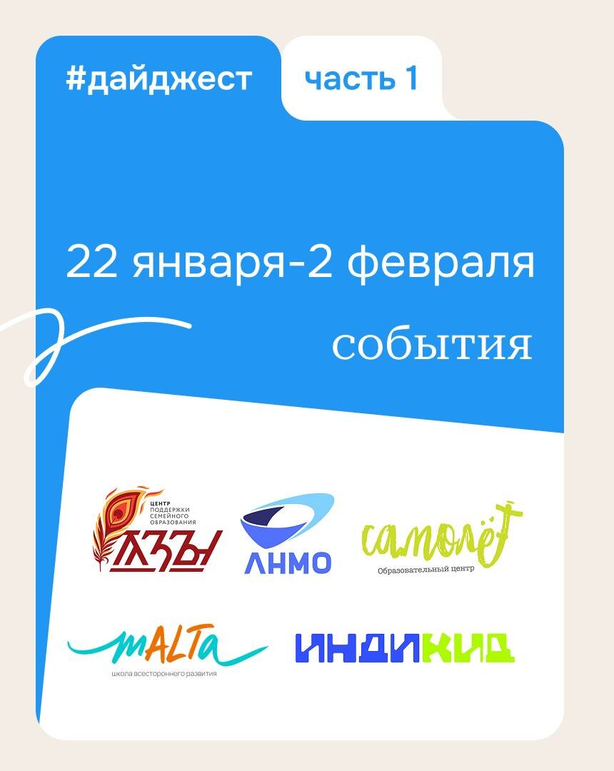 : : • 22 января День открытых дверей в школе ИндиКид Крестовский остров https://vk.cc/cH2Yb4 • 24 января День открытых дверей в образовательном пространстве «Лаборатория непрерывного математического обучения»Адмиралтейский район https://vk.cc/cTBlPB • 24 января День открытых дверей для поступления в 1 класс в Семейном 1 классе на Черной речке Приморский район https://vk.cc/cTBlVE • 24 января Мафия в Подростковом клубе в ОЦ Самолёт Выборгский район https://vk.cc/cTBm3m • 26 января Родительское собрание для будущих первоклассников в центре поддержки семейного образования «Азы» Приморский район https://vk.cc/cTBmgn • 27 января День открытых дверей в школе Мальта Центр https://vk.cc/cTBmuV