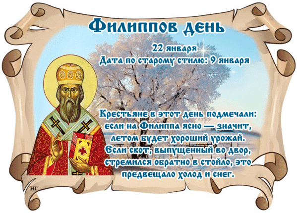 22 января 2026 года по православному календарю совершается память святителя Филиппа, митрополита Московского и всея Руси, чудотворца и исповедника, который в лихую годину опричнины явил образец архипастырского дерзновения и непреклонной верности Христовой истине. В сей день Святая Церковь воспоминает подвиг святителя, не побоявшегося обличить беззакония царя Иоанна Грозного и принявшего за сие мученическую кончину, а также продолжает попразднство Богоявления. В народе праздник сей именуется Филиппов день, знаменующий возвращение к хозяйственным трудам после святочного ликования, когда зима ещё крепка, а душа готовится к Великому посту в смирении и трудолюбии.