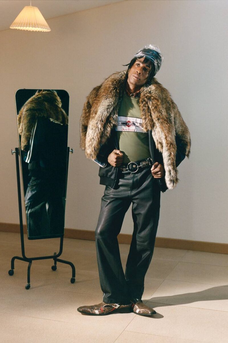 — коллекция получилась очень игривой, эксцентричной и насыщенной визуальными отсылками — это не просто одежда, а своего рода спектакль с культурными намёками и самоиронией. дизайнер искала вдохновение в образах людей с ярким стилем — от короля Генриха VIII до музыканта Джеймса Брауна и британского боксёра Prince Naseem, добавляя эту эпичность в одежду. • Манжеты и рукава с «объёмом», напоминая исторические doublet’ы Тюдоров, переосмыслены в спортивные куртки и бомберы. • Многие вещи — экспериментальные и драматичные, с сильной визуальной игрой форм. Ключевые элементы: • Жакеты с деталями шитья в стиле корсета и сатиновые бомберы с капюшонами. • Кожаные брюки с шнуровкой спереди и рубашки, комбинированные с элементами, напоминающими нижнее бельё. • Акценты из эко-меха (иногда яркого цвета), вставки с анимал-принтом и крупные утилитарные куртки — всё это создаёт богатую, немного деконструированную эстетику. Коллекция балансирует между опулентностью эпохи Возрождения, 90-ми клубным ст