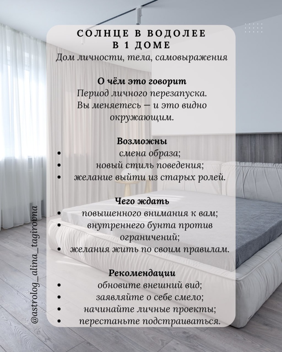 Этот пост — не общий прогноз, а небольшая личная инструкция, зависящая от того, по какому дому вашего гороскопа идёт транзит. Ориентируйтесь по натальному дому Водолея (по дате, времени и месту рождения). Если вы пока не знаете, в каком доме вашей натальной карты находится знак Водолея, или не умеете это определить самостоятельно — напишите в комментариях свои данные (дату, время и место рождения). Я посмотрю вашу карту и обязательно подскажу, где идёт транзит Солнца именно у вас. Продолжение читайте в следующих постах. *Контент содержит личное мнение автора. АстроПсихолог Алина Тагировна #ежемесячные_астротенденции #Солнце_в_Водолее #рекомендации #прогноз ❤️
