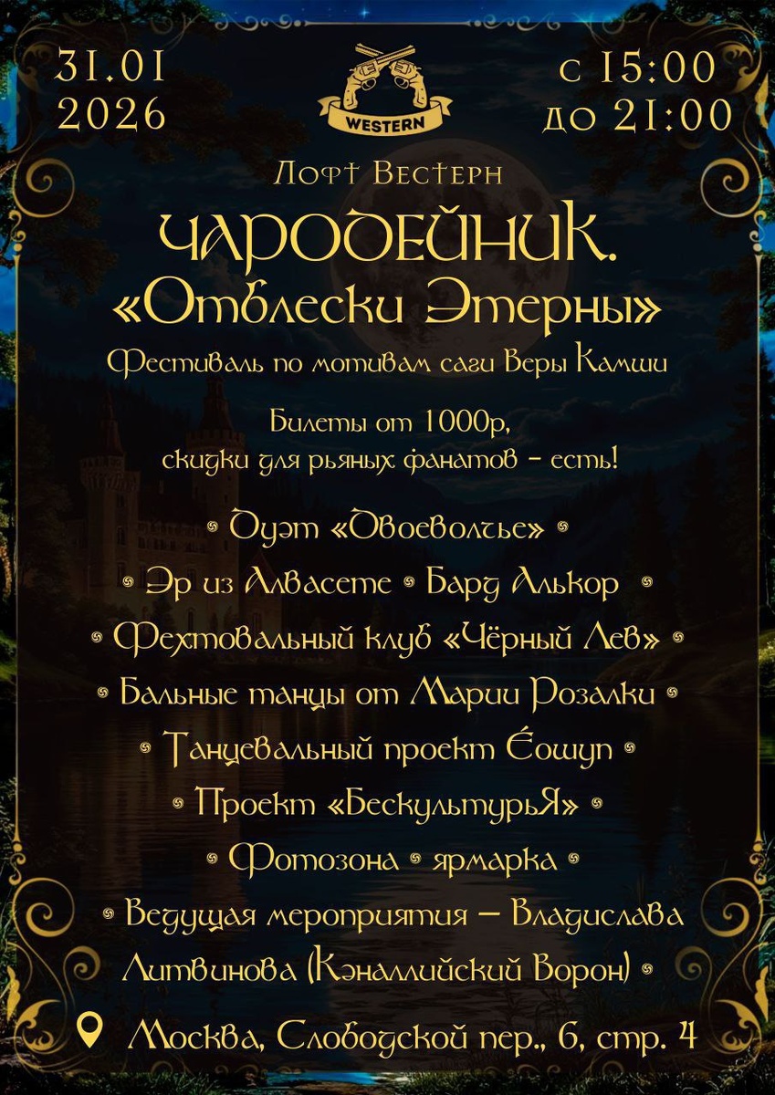 » Приглашаем вас в путешествие по миру «Отблесков Этерны» Веры Викторовны Камши. Это не просто встреча читателей, это — погружение в мир, где каждая нота — портал, а каждый жест — заклинание. Вечер, в котором оживёт не только дух, но и сама буква её вселенной. В путь по волнам книжной истории отправимся вместе с группой «Эр из Алвасете». В их музыке звучат любимые сюжеты и персонажи, а каждый слушатель чувствует себя героем происходящих событий. А ещё мы подготовили грандиозный сюрприз для всех поклонников, ради которого имеет смысл чекнуть группу фестиваля 27-го января ;) Команда корабля: «Двоеволчье» — дикая, земная поэзия; Бард Алькор — старинные баллады и новые саги; Фехтовальный клуб «Чёрный Лев» — танец, в котором поёт сталь; Бальные танцы от Марии Розалки — грация, влюбляющая с первого па; Танцевальный проект Éowyn — движение как магия; Проект БескультурьЯ — ирония, огонь и любовь к хаосу; Фотозона и ярмарка; Ведущая мероприятия — Владислава Литвинова (Кэналлийский В