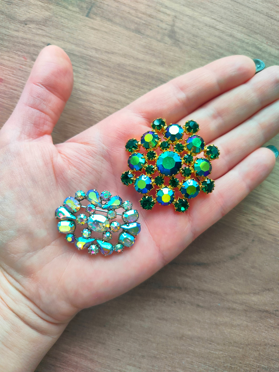 Итак, моя самая любимая покупка - броши Аврора бореалис. Это Чехословацкие броши из 60-х годов. Белую пока ни разу не одевала, а зелёную ношу регулярно) Посмотрите, какие они красивые: