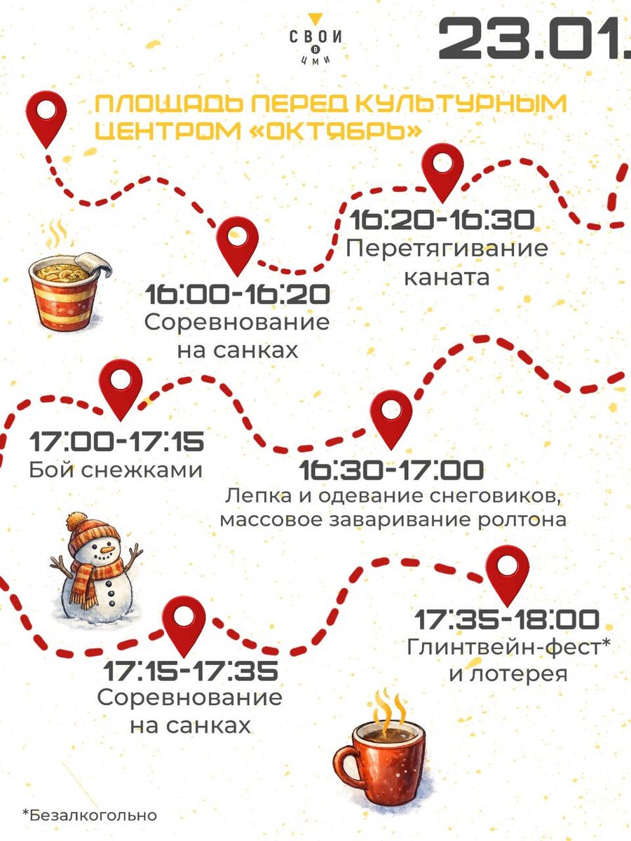 На площади перед КЦ «Октябрь» с 16:00 до 16:20 пройдут соревнования по катанию на санках, после чего с 16:20 до 16:30 всех желающих ждёт турнир по перетягиванию каната. Творческая часть программы начнётся в 16:30, участники займутся лепкой и «одеванием» снеговиков, а также примут участие в необычном массовом заваривании лапши быстрого приготовления — эти активности продлятся до 17:00. Любители активных развлечений смогут повеселиться в бою снежками с 17:00 до 17:15. Вторые заезды на санках пройдут с 17:35 до 18:00, а завершатся они глинтвейн-фестом с лотереей. Внутри культурного центра в это время также ждёт множество интересных занятий. В большом зале с 16:30 до 18:00 пройдёт музыкальное лото, а параллельно с этим будет работать музей сенсорики. В летнем кинотеатре с 16:00 до 18:00 состоится показ мультфильмов, а завершить день можно будет на катке, массовый заезд на котором начнётся в 19:00. ❤️, если уже придумали отговорку для шефа, чтобы сбежать на массовое заваривание дошика П