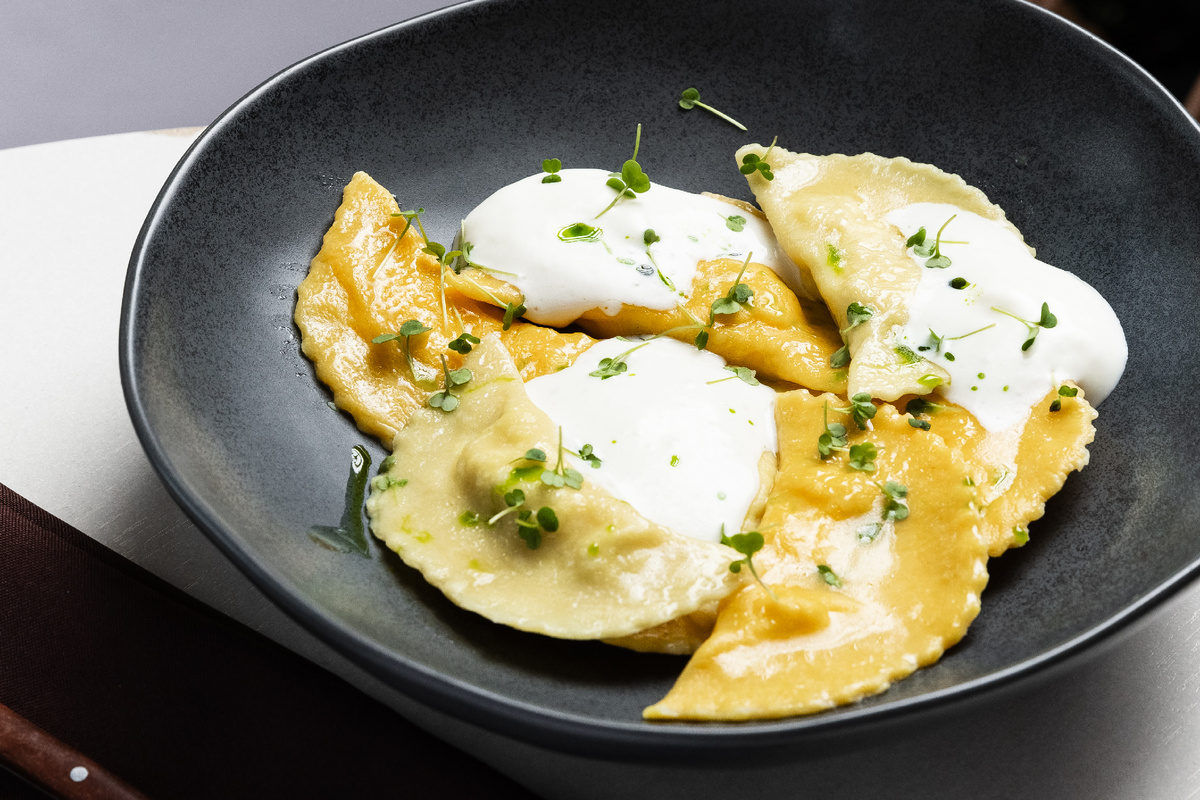 Если пельмени вам уже немного поднадоели, то можно переключится на их итальянских собратьев – равиоли. От наших они отличаются чуть более плотным тестом, поэтому мясную начинку для них используют не в сыром виде, а предварительно немного подготавливают. Любопытный вариант равиоли с курицей и мягким сыром мы нашли в сочинском бистро «Авли», где гостей угощают блюдами греческой и северокавказской кухни. Равиоли от шеф-повара Егора Чернова внешне очень напоминают вареники, но вкус и текстура у них все-таки другие. Вот как их можно приготовить дома. На порцию из четырех штук вам потребуется: Для теста: Для начинки: Чтобы приготовить тесто, вбиваем в муку яйца и начинаем месить, добавляя соль по вкусу. Можно использовать блендер. Замешиваем тесто вручную 6-7 минут, если в блендере – 2-3 минуты. Получаем липкую упругую массу. Далее хорошо вымешиваем тесто руками, немного подсыпая муки. Тесто должно получиться однородным и гладким. Затем даем тесту отдохнуть. Для этого заворачиваем в пленку и