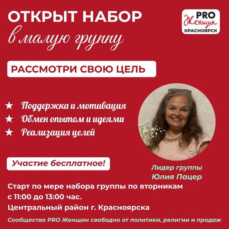 ЮЛИИ ПАЦЕР "РАССМОТРИ СВОЮ ЦЕЛЬ" Участие безоплатное! 🎁 Группа поддержки для женщин, которые хотят воплотить свои мечты Вас ждут: ✅ Теплый круг ✅ Мечты и их воплощение ✅ Поддержка и мотивация ✅ Рассмотрим цели методом "6- ти шляп" Группа будет проходить по методологии сообщества PRO Женщин, которая зарекомендовала себя как рабочая и результативная! ✔ Старт по мере набора группы ✔ Встречи по вторникам 11:00 - 13:00 ✔ Еженедельно 8 встреч ✔ Центр г. Красноярска ⭐️ Если хотите присоединиться или задать вопрос, пишите в личные сообщения http://t.me/Yulya_Zozulya В малых группах нашего сообщества Вы получите мощный ресурс - поддерживающее окружение с целью самореализации и достижения целей! Это не терапевтическая или психологическая группа, а группа единомышленниц, которая поделится с вами своим теплом и опытом! ❤️ Поделитесь постом, нажав маленькую стрелочку справа ➡️ #Анонс_групп_pro_women_krsk Важно знать: Все встречи безоплатны, в них нет политики, религии и продаж