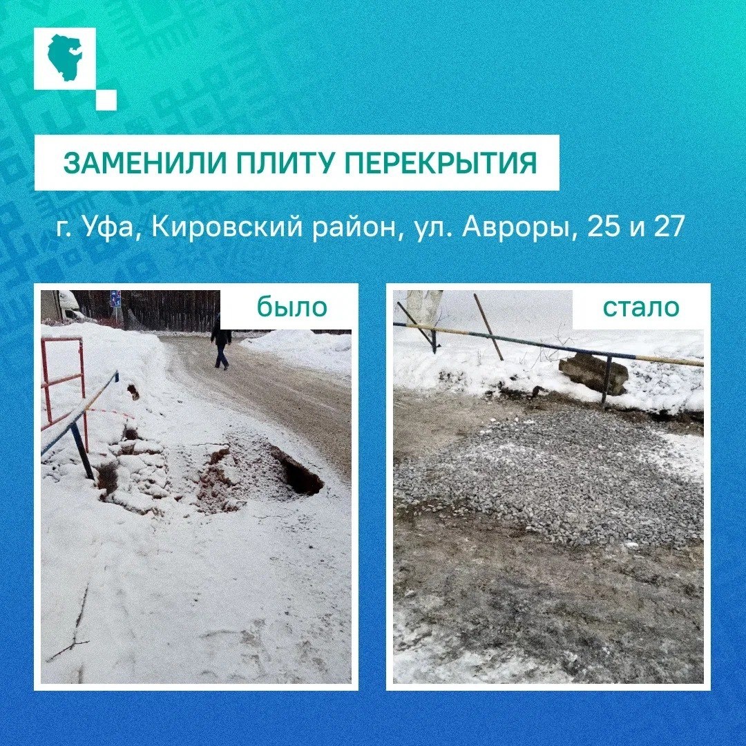 😀😃😄😁 Жители Кировского района Уфы в соцсетях попросили обратить внимание на участок дороги между домами №25 и 27 по улице Авроры. О том, что здесь провалилось дорожное полотно, они написали 20 января 2026 года. ЦУР Башкортостана зафиксировал обращение. Администрация Кировского района связалась с профильными службами. Специалисты выехали на место и выяснили, что на этом участке дороги проходит теплотрасса и повредилась плита перекрытия. 21 января плиту перекрытия заменили.