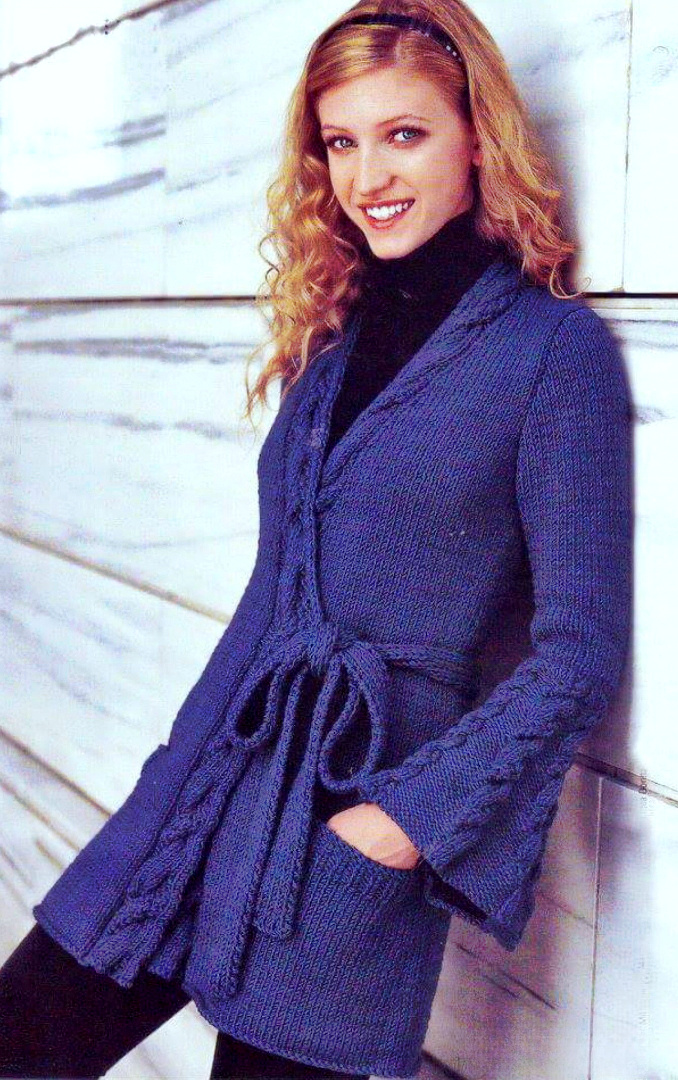 № 1: Васильковый кардиган-кимоно на поясе с расклешенными рукавами и узором из «кос» ♥