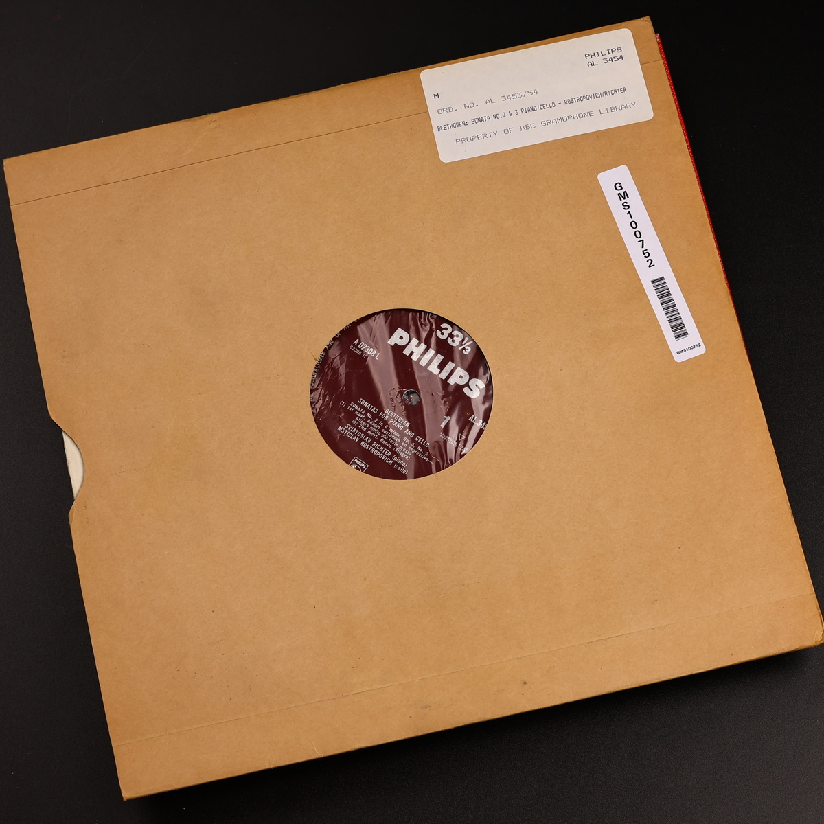В продолжении темы моно сразу же делюсь своей находкой. Philips AL 3453 Mono с Ростроповичем и Рихтером — это запись, где важно не эффектное стерео-пространство, а плотность жеста и ощущение запредельного внутреннего давления. В моно это закономерно: два титана не разбросаны по панораме, а стоят перед вами единым, несокрушимым блоком. Сегодня ко мне в руки попал особенный экземпляр — «Property Of BBC Gramophone Library». Библиотека ВВС никогда не покупала пластинки в магазине за углом. Они получали так называемые promotional copies — экземпляры из самых первых партий, отправленные лейблом для трансляции. Для звука это значит одно: Early Stamper. Пластинка отпечатана со свежей матрицы, которая еще способна передать мельчайшие детали атаки смычка Ростроповича и затухания педали Рихтера. К концу тиража эти нюансы стираются, но у меня в руках «горячая» копия, звук которой максимально приближен к мастер-ленте. Пластинки ВВС — это рабочие лошадки. Их не ставили на полку пылиться, их ставили