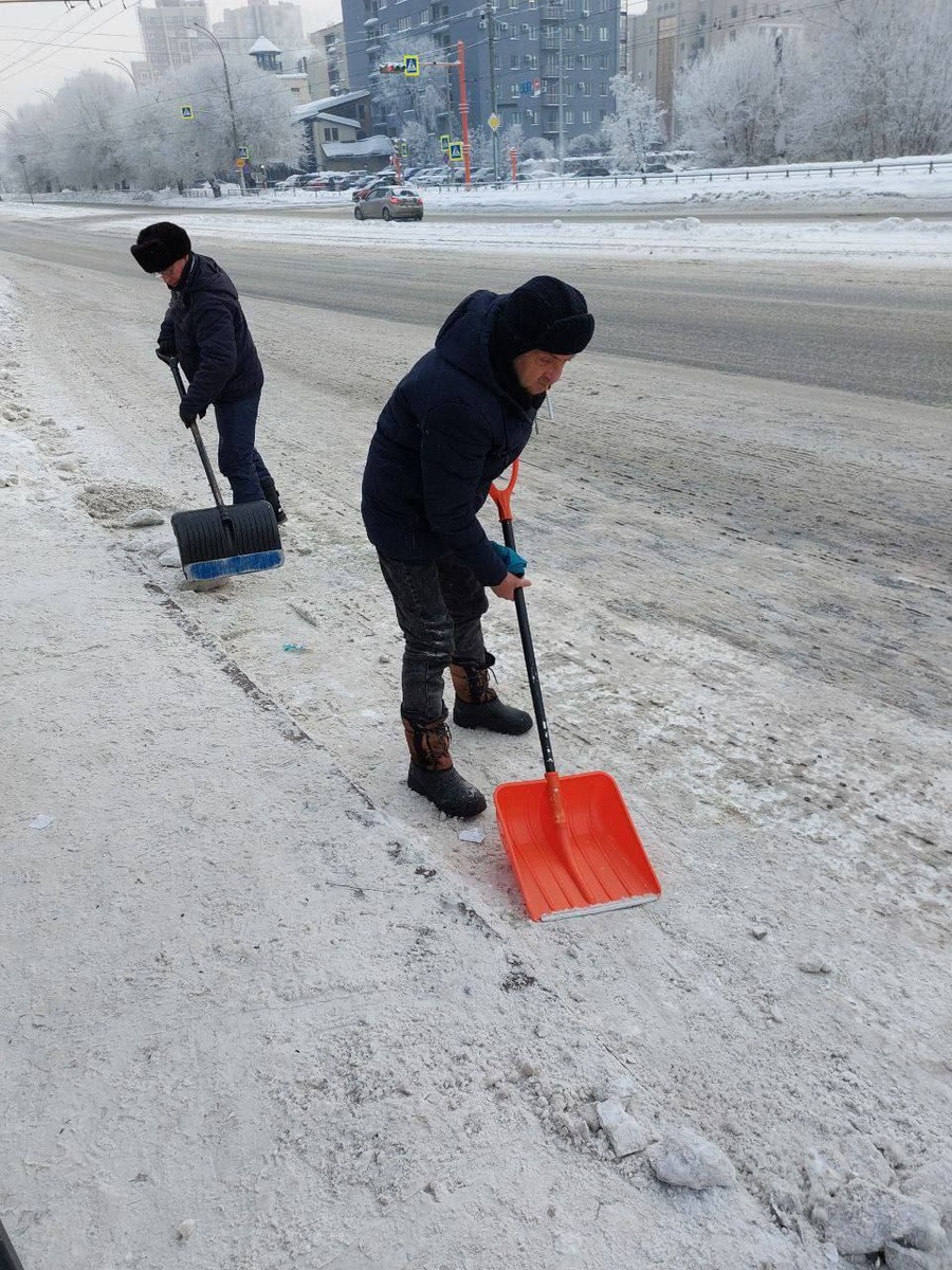 В Центральном районе Кемерова очищают от снега и наледи остановки общественного транспорта