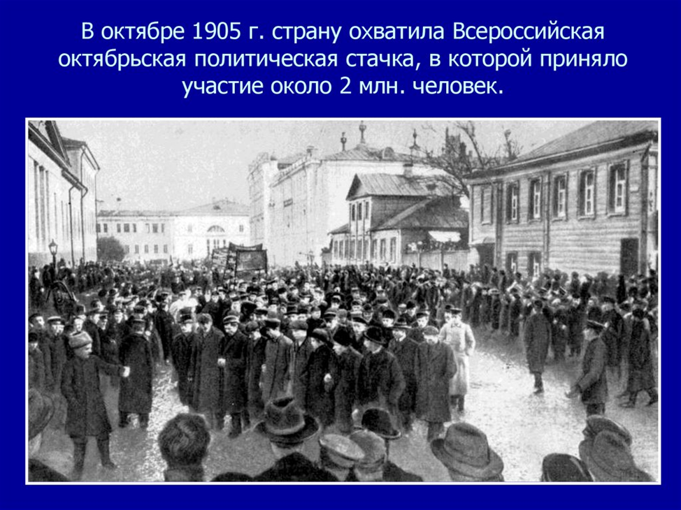 Всероссийская политическая стачка. Выразилась в массовом прекращении работы всех основных предприятий, остановке транспортного сообщения. Сопровождалось массовыми демонстрациями и акциями протеста. Представляет собой ключевой эпизод Первой Российской Революции 1905-1907 гг. Началась в Москве 19 сентября (2 октября) 1905 г. с забастовки рабочих типографии. К 13 (26) октября стачечным движением были охвачены практически все губернии Российской империи. Проходила под антиправительственными, демократическими и экономическими лозунгами. Главными причинами стачки были тяжелые условия труда рабочего класса, а также отсутствие политических прав и свобод. Под давлением бастующих император Николай II был вынужден подписать Манифест, изменившей устройство страны с самодержавной на конституционную монархию. Первая революция в России началась 9 января 1905 г. и шла по нарастающей. В нее были вовлечены самые широкие слои населения: · рабочие; · служащие; · интеллигенция; · мелкая и средняя буржуазия