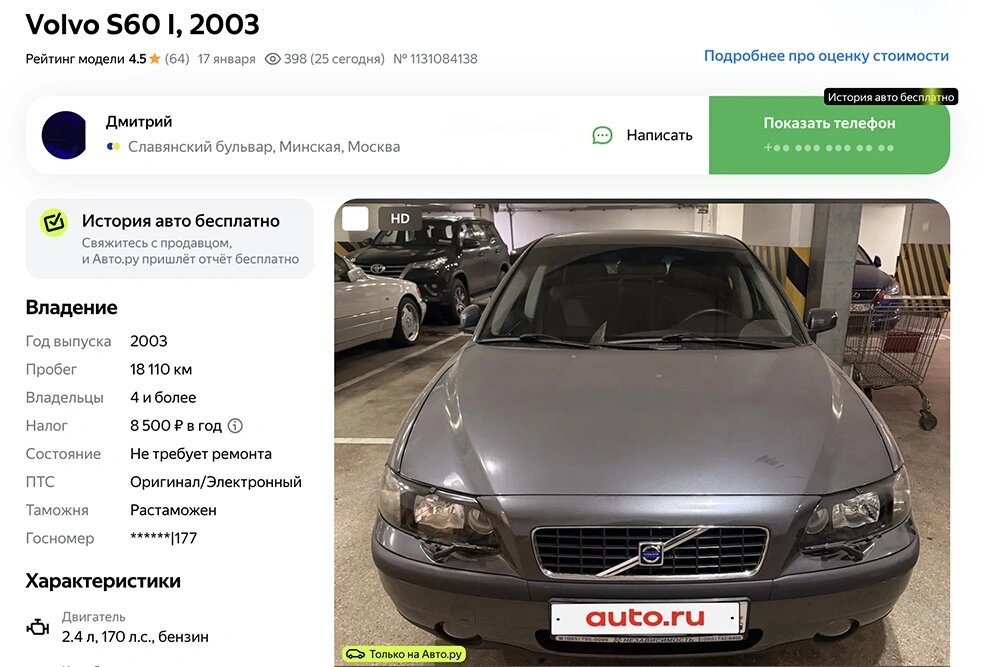 В России продают Volvo S60 2003 года с пробегом всего 18 110 км: известна цена