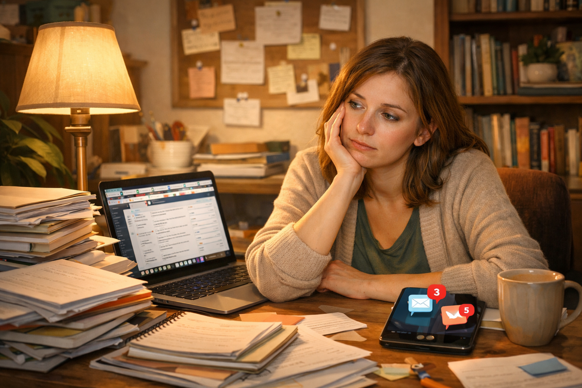 Шесть вещей. Бумажные стопки. Бесконечные вкладки. Мессенджеры в постоянном доступе. Файловый хаос. Ручная рутина. Чувство вины.