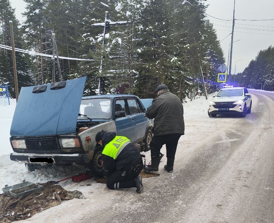 В прошлое воскресенье, 18 января, около 11 утра, экипаж ДПС находился в командировке в Питкярантском районе. Инспекторы Роман Ивашов и Денис Черкавский ехали по дороге «Олонец – Питкяранта – Леппясилта» и на 145-м километре, у опасного поворота, заметили стоящий у обочины автомобиль. Из-под машины были видны ноги человека, что вызвало у полицейских тревогу. Они сразу остановились. Выяснилось, что у водителя во время движения заблокировало колесо. Он пытался снять его и починить сам, но у него ничего не получалось. Инспекторы быстро организовали помощь. Чтобы обезопасить место на повороте, старший инспектор Денис стал регулировать движение, предупреждая проезжающих водителей об аварийной машине. А инспектор Роман, взяв инструмент из патрульной машины, помог найти и устранить поломку. Вскоре колесо было установлено обратно. Пожилой водитель, местный житель, поблагодарил полицейских и смог спокойно поехать дальше в Питкяранту.