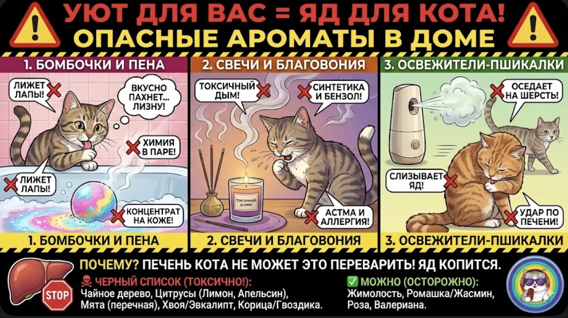 Мы хотим, чтобы дома пахло «альпийской свежестью» или «ванильным печеньем». Мы зажигаем свечи, кидаем в воду бурлящий шар и включаем автоматический освежитель в коридоре. А потом удивляемся: почему у Барсика слезятся глаза? Почему он стал вялым? Почему анализы печени плохие, ведь он ест хороший корм? Ответ висит в воздухе. Буквально. То, что для нас - ароматерапия, для кошки - химическая атака. Давайте пройдемся по списку ваших любимых ароматов и посмотрим, что с ними не так. 1. Бомбочки для ванн (Соленая ловушка) Вы лежите в розовой воде, пахнет цитрусом, красота. Кот сидит на бортике, дышит этим паром, а может, и лапкой воду потрогал. В чем опасность: • Эфирные масла в паре. Горячая вода заставляет масла испаряться мгновенно. В маленькой ванной комнате концентрация становится запредельной. Для чувствительных легких кота это риск спазма или отека. • Облизывание. Это самое страшное. Кот прошелся по бортику ванны, где остались брызги, или макнул хвост. Потом он это слижет. А внутри бом