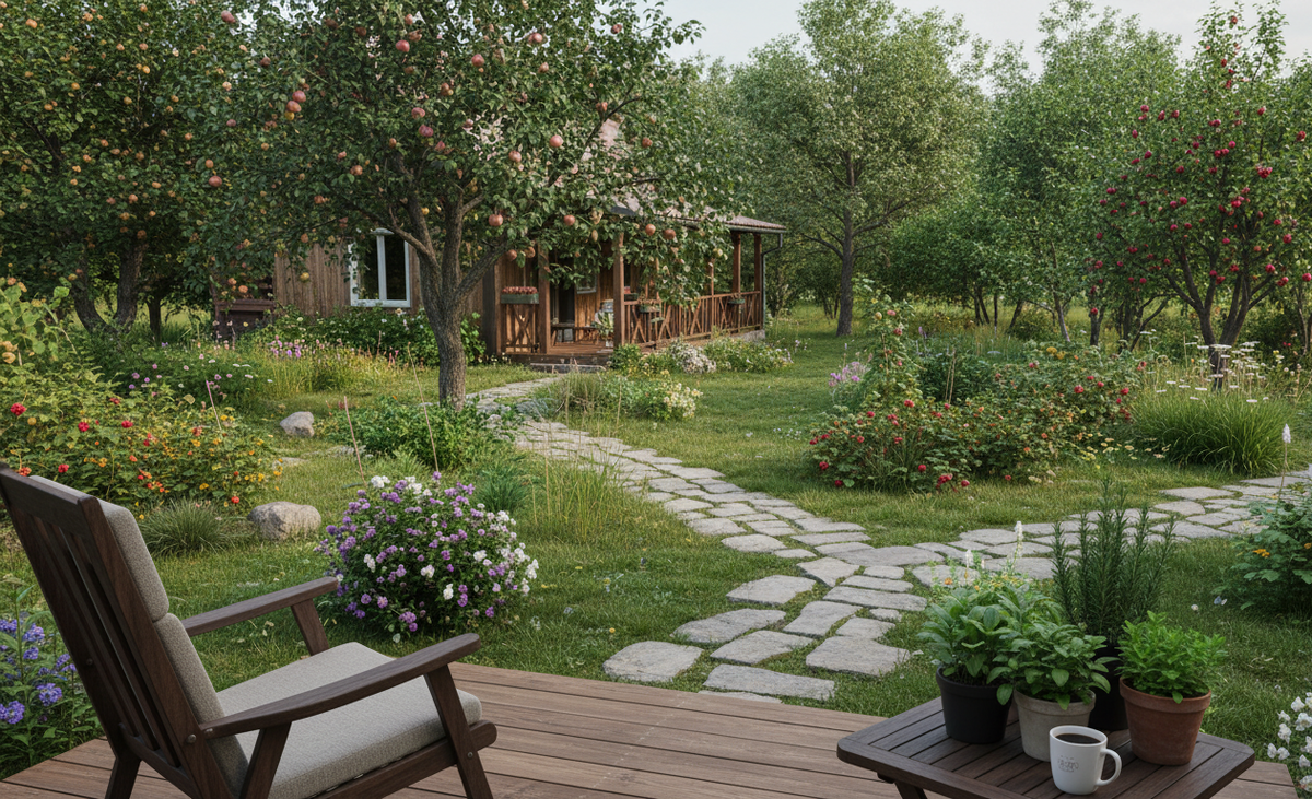 Растения - союзники, а не тираны: Выбираются не по редкости или капризности, а по выносливости и самостоятельности. Это местные сорта кустарников (сирень, калина, пузыреплодник), которые цветут без вашего участия. Это почвопокровные растения (барвинок, очиток) вместо газона. Это плодовые деревья и ягодные кусты, которые дают не только красоту, но и урожай. Это пряные травы у крыльца, которые пахнут, когда их задеваешь.
