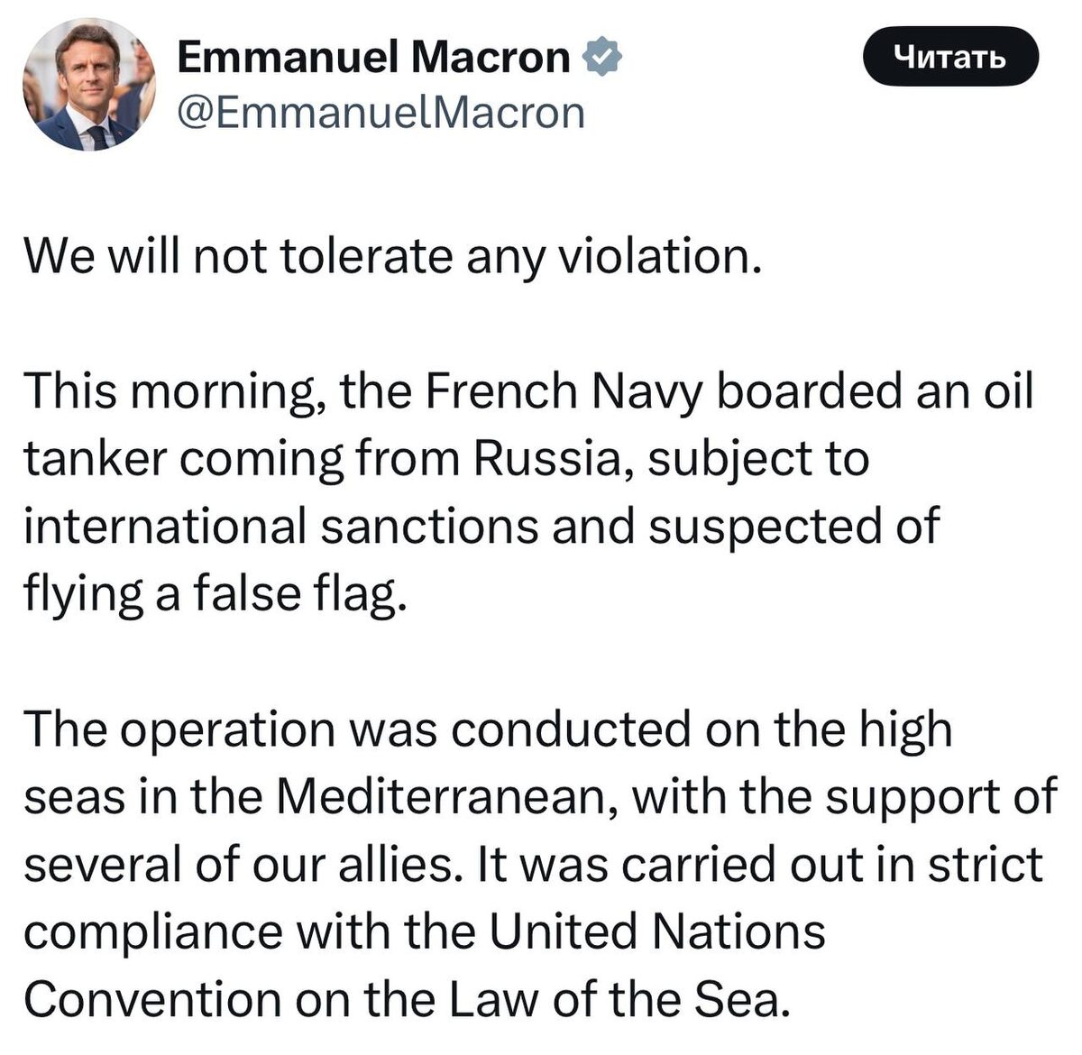 ⚡️ Франция впервые задержала в Средиземном море танкер, следовавший из РФ, утверждает президент республики Эммануэль Макрон