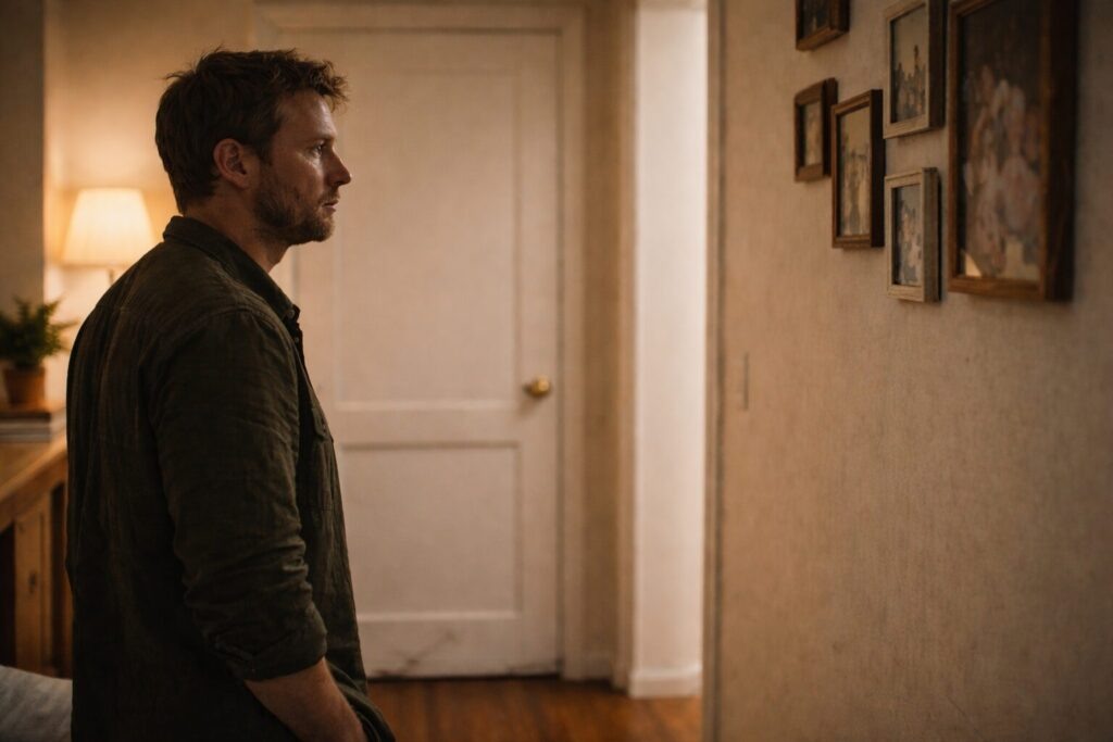 Он зашёл. Прихожая — та же. Его куртка больше не висит на крючке, там теперь — мужская ветровка, незнакомая. Кроссовки у двери — большие, сорок четвёртый размер. Не его.