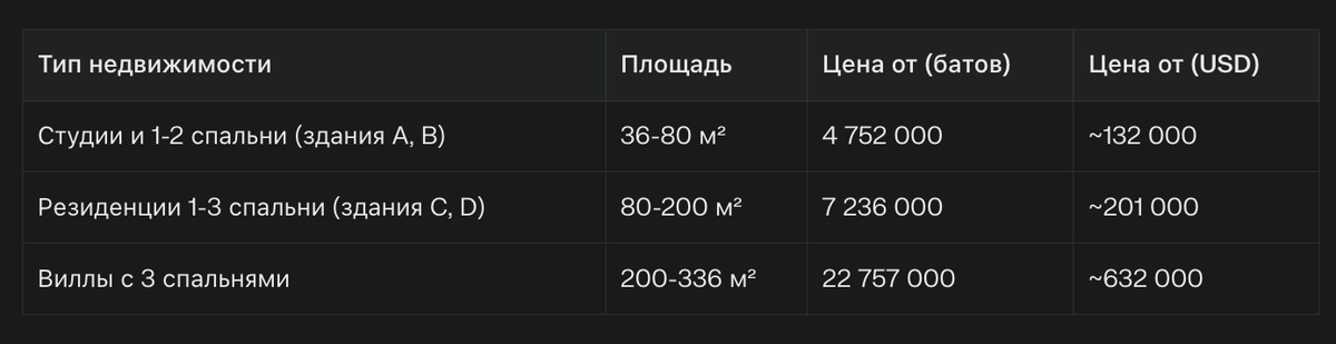 Комплекс разделен на несколько секций. Здания А и В — кондоминиум с квартирами от студий до двухкомнатных апартаментов стоимостью от 4 752 000 батов. Здания C и D — резиденции с 1-3 комнатами от 7 236 000 батов. Виллы с тремя спальнями и личными бассейнами оснащены технологиями «умного дома» и стоят от 22 757 000 батов.