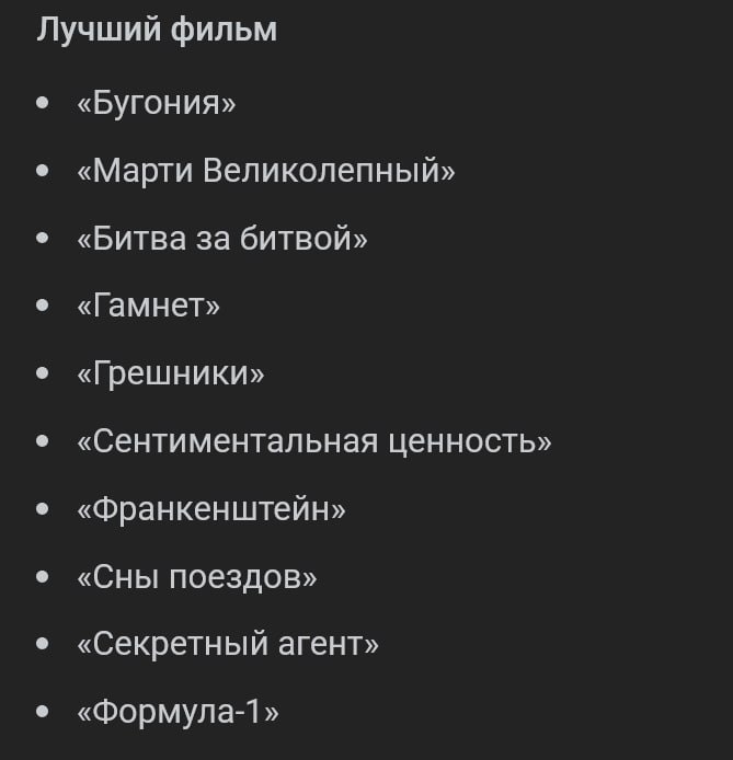 » Абсолютным лидером по количеству номинаций стали «Грешники» Райана Куглера — фильм собрал 16 упоминаний и переписал рекорд премии. Претенденты на «Лучший фильм» выглядят так: 🟠«Бугония»; 🟠«Марти Великолепный»; 🟠«Битва за битвой»; 🟠«Гамнет»; 🟠«Грешники»; 🟠«Сентиментальная ценность»; 🟠«Франкенштейн»; 🟠«Сны поездов»; 🟠«Секретный агент»; 🟠«Формула-1». Отдельно приятно: в категории «Лучший анимационный короткометражный фильм» отметили российский мультфильм «Три сестры» Константина Бронзита. Готовим попкорн и споры в комментах — ночь на 16 марта обещает быть жаркой.... Подробнее: https://hard-tm.su/threads/142109/ 🕹HARD-TM — Подписаться