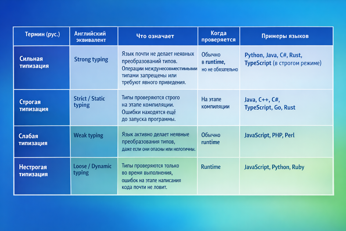 Примеры: Java, C++, Rust, TypeScript. 🔹Нестрогая типизация (часто синоним динамической типизации):
