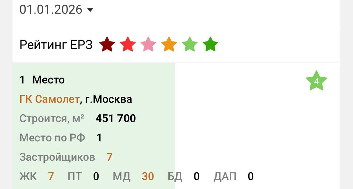 «Самолет», тем временем, снова первый — теперь в рейтинге ЕРЗ по объему текущего строительства жилья в Новой Москве