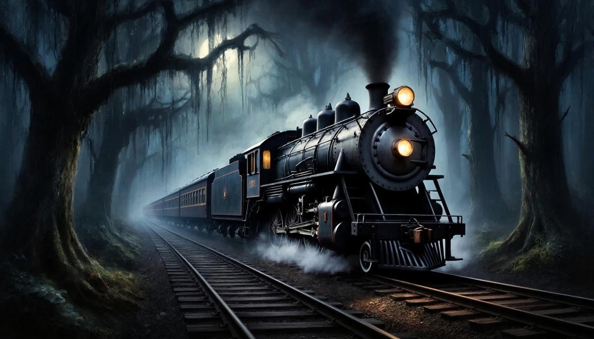 Где-то далеко, в глубине леса, раздался гудок паровоза. Протяжный, тоскливый, низкий звук, от которого внутри всё сжалось. Следом за гудком послышался перестук колёс. Звук нарастал, но шёл не по рельсам, а словно отовсюду сразу — из леса, с неба, из-под земли.